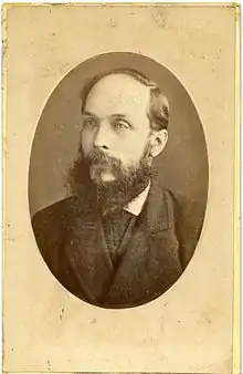 John Eastman Palmer was born around 1830 in Devon; he was the brother of William Eastman Palmer, and in 1841 was living with his family in West Street, Okehampton.[3] He signed his photographs John E. Palmer or J.E. Palmer. As of 2011 there are three known carte de visite photographs by J.E. Palmer, taken in the 1860s to 1880s when he was working from 58 Union Street, Stonehouse, Plymouth. The photographs are of an elderly widowed lady in an 1860s black bonnet and dress (shown here), a child aged two to four years (here), and a bearded man in his thirties (see image, right). The reverses of these cards (shown here) state that he was awarded a first class prize medal by the Royal Cornwall Polytechnic in 1865. The reverse of one card states that Royal letters patent were granted to him in 1872. He probably died in 1911, aged 83, at Newton Abbot.[12]