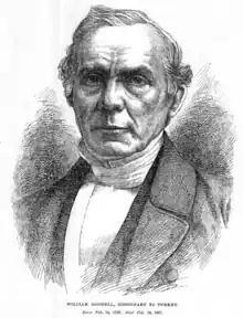 William Goodell (1792–1867) was an American missionary. He was born at Templeton, Mass., educated at Phillips Academy (Andover), Dartmouth College, and Andover Theological Seminary. He was accepted as a missionary by the American Board and at the close of 1822 sailed for Malta and thence the next year went to Beirut, where he aided in establishing the station which became the center of the Syrian mission. In 1828, on account of threatened war between England and Turkey, the missionaries moved to Malta, where Goodell worked in the preparation and printing of books for the mission, until the defeat of the Ottoman fleet at Navarino in 1831, when the way to Constantinople was open and he commenced the Armeno-Turkish mission. During his missionary life, he and his devoted wife endured many trials and perils and were compelled to move their residence 33 times in 29 years. One of his main works was the translation of the Bible into Armeno-Turkish (Turkish written in Armenian letters), spending twenty years in the task and its revision. In 1865, after 43 years, he returned to the United States and died in Philadelphia on February 18, 1967, at the residence of his son, Dr. William Goodell. His son-in-law Edward Dorr Griffin Prime published his memoirs in 1876.