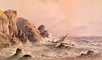 Cresswell's paintings are mostly landscape scenes in rural or even wilderness settings, animal scenes, or maritime topics showing primarily coastal scenes from the Atlantic. Especially in the latter, the influence of Stanfield—himself a noted painter of maritime scenery—has been noted by Harper. In time, the hard luminosity of his early paintings developed into a broader, more generalized handling.[11] Like Albert Bierstadt, he depicted a timeless wilderness in which light played a semi-religious role.[9] Daniel Fowler is the first artist in Canada with whom a friendship is recorded and Cresswell probably knew others such as Robert Whale.[12] In Canada, Cresswell began teaching the young Robert Ford Gagen in 1863, and thirteen years later also the then sixteen years old George Agnew Reid.[12]