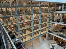 The Ohio State University's University Libraries manages 15 locations on the Columbus campus, of which the Thompson Library is the largest.[1] In addition to housing the main stacks and serving as the central research library for the entire campus, the Thompson Library is home to many of the subject libraries in the humanities and social sciences, as well as reference, special collections, rare books and manuscripts, journals, and general interest periodicals. Departmental subject libraries include literature, foreign language by region, linguistics, philosophy, religion, theater, anthropology, history, sociology, and political science. Some subject libraries, such as science and engineering, architecture, agriculture, fine arts, law, health sciences, veterinary sciences, and geology, are housed in the university's other libraries.[2]