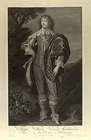 One of ten children, Villiers' siblings included Anne (1610-1654), John (1616-1659), George (1618-1699), Barbara (1618-1681) and Edward (1620-1689). The Villiers were a powerful and well connected family; William's relatives included John Villiers, 1st Viscount Purbeck, Christopher Villiers, 1st Earl of Anglesey, and Susan Feilding, who was Lady of the Bedchamber to Queen Henrietta Maria.[2]