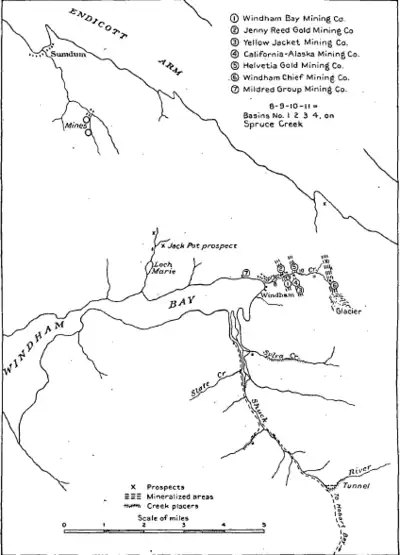 The earliest gold production in Alaska occurred in Windham Bay and Sumdum Bay in 1870-71 subsequent to an 1869 gold placer deposit discovery at the two locations.[1] The Windham Bay Gold Mining Company was located .75 miles (1.21 km) from the bay, on the south slopes of Spruce Creek. It consisted of nine claims known as the "Red Wing" group.[2]