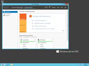Screenshot of Windows Server 2012, showing the Server Manager application which is automatically opened when an administrator logs on, taskbar, and the blue color of Aero Lite