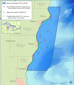 The Wisconsin Shipwreck Coast National Marine Sanctuary is one of 15 United States National Marine Sanctuaries[2] administered by the National Oceanic and Atmospheric Administration (NOAA), an agency of the United States Department of Commerce; NOAA co-manages the sanctuary jointly with the State of Wisconsin. It is located in Lake Michigan along the coast of Wisconsin. It was created in 2021 to protect shipwrecks considered nationally important archaeological resources.[3]