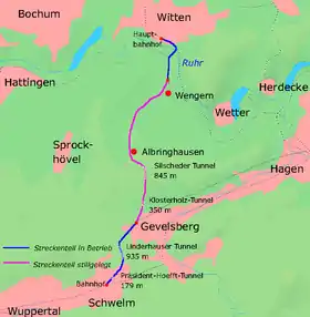 - 1 2 3 4 5 "Line 2143: Witten - Schwelm". NRW Rail Archive (in German). André Joost. Retrieved 28 November 2013.