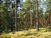 The region is about 1000 km² large. In the north it borders to the Szczecin Lagoon and in the east on the Oder. In the west the lowland of the Friedländer Großen Wiese forms the border and in the south the line Stettin-Pasewalk forms it. The Ueckermünde Heath is a lowland area, where only a few points reach heights above the 20 metre above sea level (except for: Dachsberge south of Hintersee with 48 metres). The forest area is crossed by the rivers Uecker, Randow and Zarow. There are also numerous protected moors, especially in the border area with Poland. The swamps were also the reason why the heath was colonised relatively late. In the 17th century it was mainly colonists who set up charcoal burners and glassworks. The frequent occurrence of bog iron was the basis for the metal processing plants, primarily in Torgelow. In the middle of the area there is a military training area of about 50 km², which is used by the Bundeswehr (barracks in Torgelow and Eggesin). Today, the Ueckermünde Heath is important for forestry, but also increasingly for tourism. In addition, there is a diverse flora and fauna. Since 2015 there has also been a pack of wolves and their offspring living in the Ueckermünde Heath.[1] Cranes, screaming eagles and white-tailed eagles breed in the forests and moors.