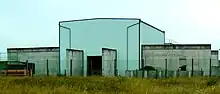 View from West onto the static inverter hall of never realized Wolmirstedt HVDC-back-to-back plant. One can see clearly the transformer bays. The building is today part of Farsleben Recycling Yard