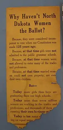 The first state suffrage convention was held in Grand Forks in 1895.[11] In July 1901, the Equal Suffrage Association of North Dakota held its annual convention in Devil's Lake.[12] Activists at the convention highlighted the idea, "Taxation Without Representation is Tyranny."[12] From 1901 to 1911, every session of the state legislature submitted a women's suffrage bill for consideration.[11]