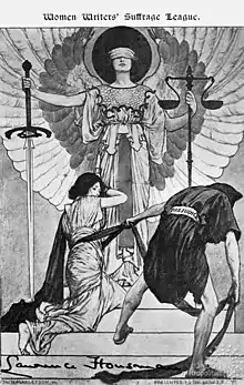 The Women Writers' Suffrage League (WWSL) was an organisation in the United Kingdom formed in 1908 by Cicely Hamilton and Bessie Hatton.[1] The organisation stated that it wanted "to obtain the Parliamentary Franchise for women on the same terms as it is, or may be, granted to men. Its methods are the methods proper to writers – the use of the pen."[2] The organisation viewed itself as a writers' group rather than a literary society.[3] Membership was not based on literary merit, but instead was granted to anyone who had published and sold a written work.[3] Members also paid an annual subscription fee of 2s. 6d.[4] The league was inclusive and welcomed writers of all genders, classes, genres, and political persuasions provided they were pro-suffrage.[3] By 1911 the league was composed of conservatives, liberals and socialists, women of power and women who worked hard and members of the military.[5] The league disbanded on 24 January 1919[3] following the passing Representation of the People Bill in February 1918, granting women over the age of 30 the right to vote.[6]