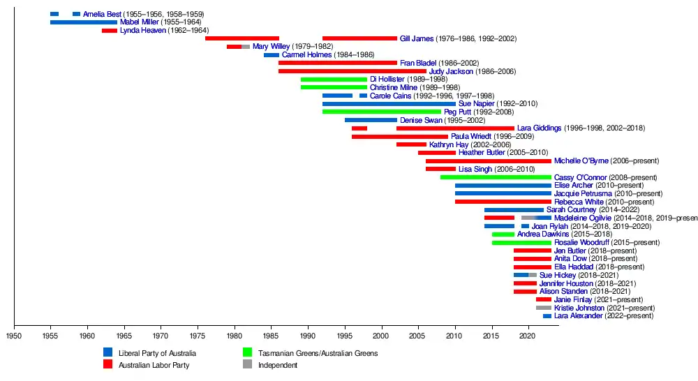 Christine Milne and Di Hollister were the first women elected to represent the Greens in 1989. Kristie Johnston was the first independent woman elected in 2021, although Mary Willey, Madeleine Ogilvie and Sue Hickey had served as independents after leaving their parties. Kathryn Hay was the first Indigenous woman elected to the Tasmanian parliament in 2002.
