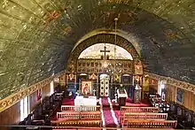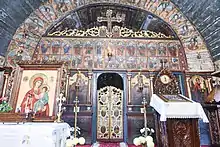 On the arch dividing the altar from the nave, there appear medallions of the Virgin Mary, the Four Major Prophets and nine of the Twelve Minor Prophets.[5] The dedicatory inscription is at the end, in Romanian Cyrillic.[6] The altar apse is painted on three registers: first, the Holy Trinity, then a variety of angels, and last a number of scenes primarily from the Gospels.[7] Despite the limited space, the artists also managed to fit fifteen images of bishops, including Gregory the Illuminator, uniquely for a Transylvanian Orthodox wooden church.[2]