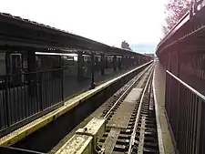 The station has two tracks, one center island platform and two disused side platforms extending south, ending a short distance north of 213th Street. The tracks end at bumper blocks at the north end of the platforms. The station was formerly set up as a Spanish solution with alighting passengers using the side platforms and boarding passengers using the island platform in a style similar to the other Bronx IRT terminals. Now all passengers use the island platform.[25] The 4 stops here at all times.[26]