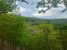The Woodstock Tower, built in 1935 by the Civilian Conservation Corps, is located on a 2000 ft mountain that overlooks the town.[47] The tower is a popular sightseeing attraction, providing panoramic views of the valleys on either side and of the seven bends of the North Fork of the Shenandoah River. In March 2019, a portion of the road leading to the tower crumbled due to erosion. The road received $350,000 worth of repairs by Virginia Department of Transportation.[48] The road re-opened again in November 2019.