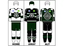 The third jersey from the 2009–10 season was tweaked for use as the regular jersey beginning in the 2010-11 season until the present. The home jersey was made white with a thick green stripe across the center of the jersey and the elbow of both arms. Above and below this thick stripe are thin stripes of black. The bottom of the jersey has a black stripe above a green stripe above a white stripe. A green maple leaf was added to each shoulder to denote the team's location in Canada. The away jerseys is inverted, the black stripes being replaced with white ones, the jersey itself going from white to black.