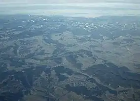 ![]() From the direction of the Feldberg to the Blumberg Gate (Blumberger Pforte, centre) the Wutach crosses the open South Baar countryside in a long forested gorge. From here it flows to the left through the Wutachflühen to the Rhine, whereas its former valley, 165 metres higher, continues to the right and runs down to the Danube. | |