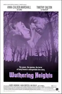 Wuthering Heights is a 1970 British drama film directed by Robert Fuest and starring Anna Calder-Marshall and Timothy Dalton. It is based on the classic 1847 Emily Brontë novel of the same name. Like the 1939 version, it depicts only the first sixteen chapters, concluding with Catherine Earnshaw Linton's death, and omits the trials of her daughter, Hindley's son, and Heathcliff's son.