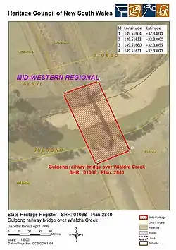 1. 1 2 "Gulgong railway bridge over Wialdra Creek". New South Wales State Heritage Register. Department of Planning & Environment. H01038. Retrieved 2 June 2018. Text is licensed by State of New South Wales (Department of Planning and Environment) under CC-BY 4.0 licence.
