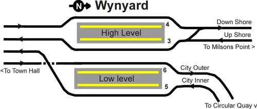 Wynyard station currently has two levels, each with two platforms. The upper level serves the North Shore line, whilst the lower level serves lines traversing the City Circle. Both lines run south under York Street from Wynyard to Town Hall. There is no connection between the rails of these two lines at Wynyard.