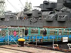 Filming for Yamato took place from March to June 2005 at a closed-down shipyard of Hitachi Zosen Corporation in Onomichi, Hiroshima Prefecture. Approximately JPY 600 million was spent in building a 1:1 scale set of the forward section and the portside anti-aircraft guns. The starboard side, aft section, and the barrels of the A turret were not built since the film only required scenes on the port side. However, compliance issues with Japan's Building Standards Act prevented the reproduction of the Yamato's pagoda tower. Instead, photographs of the Yamato Museum's own 1:10 Yamato model was used for post-production.[2] The interior scenes were made on a sound stage, but a hall near the set shows the various rooms and props reproduced for the film.