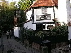 The building, in its current location, was originally known as The Round House[6] but there is no record of it being licensed as a public house under that name. The first known reference to it being an alehouse is in 1756 when it appears to be trading as The Three Pigeons. Around 1800 its name changed to the Fighting Cocks, perhaps in reference to the sport of cock fighting which was popular at the time and which may have taken place in the main bar area. The prefix "Ye olde..." is a late Victorian affectation. It is known by locals as 'The Fighters' or 'The Cocks'.[7]