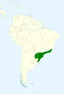 The yellow-browed woodpecker is found from Brazil's São Paulo state south through eastern Paraguay and northern Uruguay into northeastern Argentina. It inhabits the interior and edges of humid mature montane forest, dense secondary forest and woodland, and humid lowland forest. In elevation it ranges between 750 and 2,000 m (2,500 and 6,600 ft) in Brazil and generally lower in the other countries.[5]