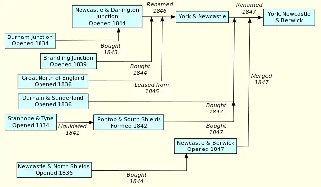 The railway was absorbed by the Newcastle & Berwick Railway in November 1844. It was extended to Tynemouth on 29 March 1847, and independent operation continued until the line north to Morpeth opened from a junction from Heaton on 1 July 1847.[61]