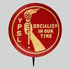 YPSL pinback from the 1930s, featuring the Socialist Party's traditional hand-and-torch logo.