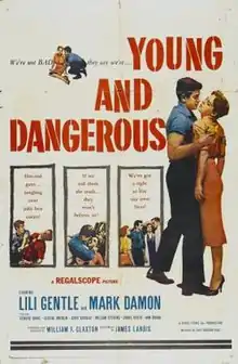Young and Dangerous is a 1957 American drama film directed by William F. Claxton and written by James Landis. The film stars Lili Gentle, Mark Damon, Edward Binns, Frances Mercer, George Brenlin and Connie Stevens. The film was released on October 30, 1957, by 20th Century Fox.[1][2][3][4]