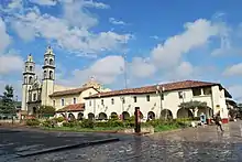 The San Pedro parish church is located near the monastery, just off the main square.[8] It is a basilica type church in Renaissance style with its main portal dating from 1564. The facade has a sculpture of Saint James the Greater flanked by angels which wear Totonaca style loincloths and boots.[2] Its main doors are made of wood and the Virgin of Guadalupe chapel displays gold leaf work and a number of oil paintings, which were done by local artists. In the cupola, there are portraits of the Four Evangelists.[8]