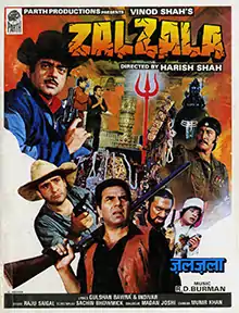 Zalzala is a 1988 Indian Hindi-language action adventure film directed by Harish Shah. It features an ensemble cast of Dharmendra, Shatrughan Sinha, Rajiv Kapoor, Anita Raj, Kimi Katkar, Vijayta Pandit, Danny Denzongpa and Rati Agnihotri.[2] It is a loose rehash of 1969 Western, Mackenna's Gold.[3][4][5]