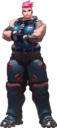 Aleksandra "Zarya" Zaryanova is a Russian woman introduced in the 2016 first-person shooter Overwatch. As a young woman in Siberia, her village was attacked by a robotic force called "omnics", which devastated the region. Seeking strength to protect her people and homeland from future assaults, she became a bodybuilding and weightlifer, and was expected to break a number of records in the world championships. However dormant omnics reactivated in the area on the even of the tournament, and she withdrew from the competition to join local defense forces.[15] To this end she uses a particle cannon, originally stated to have been torn off an enemy vessel,[4] but later retconned to be a company's experimental weapon deemed too heavy for others to use.[15] Zarya was added to multiplayer online battle arena game Heroes of the Storm during its "Machines of War event" in September 2016 at the request of that game's director Jade Martin, due to her heavy use of the character in Overwatch.[1] Zarya also returned for Overwatch 2.[15] In all appearances, Zarya is voiced by Dolya Gavanski.[3]