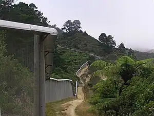 Historically about 60% of the Wellington region was covered with broadleaf forest. Karaka, kohekohe, ngaio and nīkau trees were common but there were also rātā, rewarewa and tawa with occasional podocarps like kahikatea and rimu.[5] The whole sanctuary valley was covered with this sort of forest until European settlement of the area and the large fires in 1850 and 1860 that cleared the land to be used for farming. The lower reservoir, retained by an earth dam, was completed in 1878.[6] Parts of the area continued to be farmed up until 1906 when the remaining catchment was purchased for the water works.[6] The upper reservoir, retained by a concrete gravity arch dam, was completed in 1908.[7] From this point, as the whole valley was a protected water catchment area for Wellington city, the slopes were re-vegetated with introduced trees and the native forest also began regenerating. The upper dam was decommissioned as a reservoir about 1991, the lower one in 1997.[6]