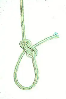A zeppelin eye knot, is a secure, jam resistant fixed size loop knot based on the zeppelin bend. It is one of the few eye knots suitable for bungee. It is also special in its ease of untying.
