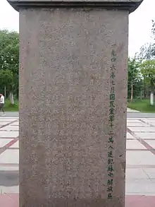 The environment of the memorial hall is beautiful and solemn with many hemlocks and other plants. The first scene in the memorial is a horizontal monument 6.4 m wide; the front of the monument carries a vigorous and forceful inscription of eight Chinese characters: 烈士英灵,永镇江海("The heroic spirit of the martyrs will abide forever, as long as the river [flows into] the sea"), by General Ye Fei. On the back of the monument is an inscriptions in honor of those martyrs.