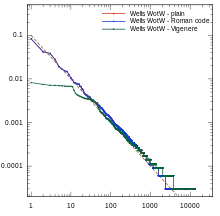 When a text is encrypted in such a way that every occurrence of each distinct plaintext word is always mapped to the same encrypted word (as in the case of simple substitution ciphers, like the Caesar ciphers, or simple codebook ciphers), the frequency-rank distribution is not affected. On the other hand, if separate occurrences of the same word may be mapped to two or more different words (as happens with the Vigenère cipher), the Zipf distribution will typically have a flat part at the high-frequency end.
