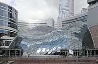 The building investor was ING Real Estate (part of ING Group), and the main contractor was Skanska construction company.[1][5] The complex was mainly designed by California-based architectural firm of Jerde Partnership.[5][6] The building construction was designed by Polish branch of engineer company Ove Arup & Partners, and its electrical installations, by Tebodin.[7][8] The Złote Tarasy shopping centre portion was designed by Poland-based architectural firm of Hrynkiewicz i Synowie Pracownia Architektoniczna.[9], and its glass diagrid roof was designed and built by Waagner-Biro.[10][11] The entire investment costed 1.5 billion Polish złoty.[12]
