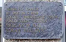 The plaque next to the entrance of the Brežice Mercator mall commemorating the laying of the foundation stone by Zoran Janković
